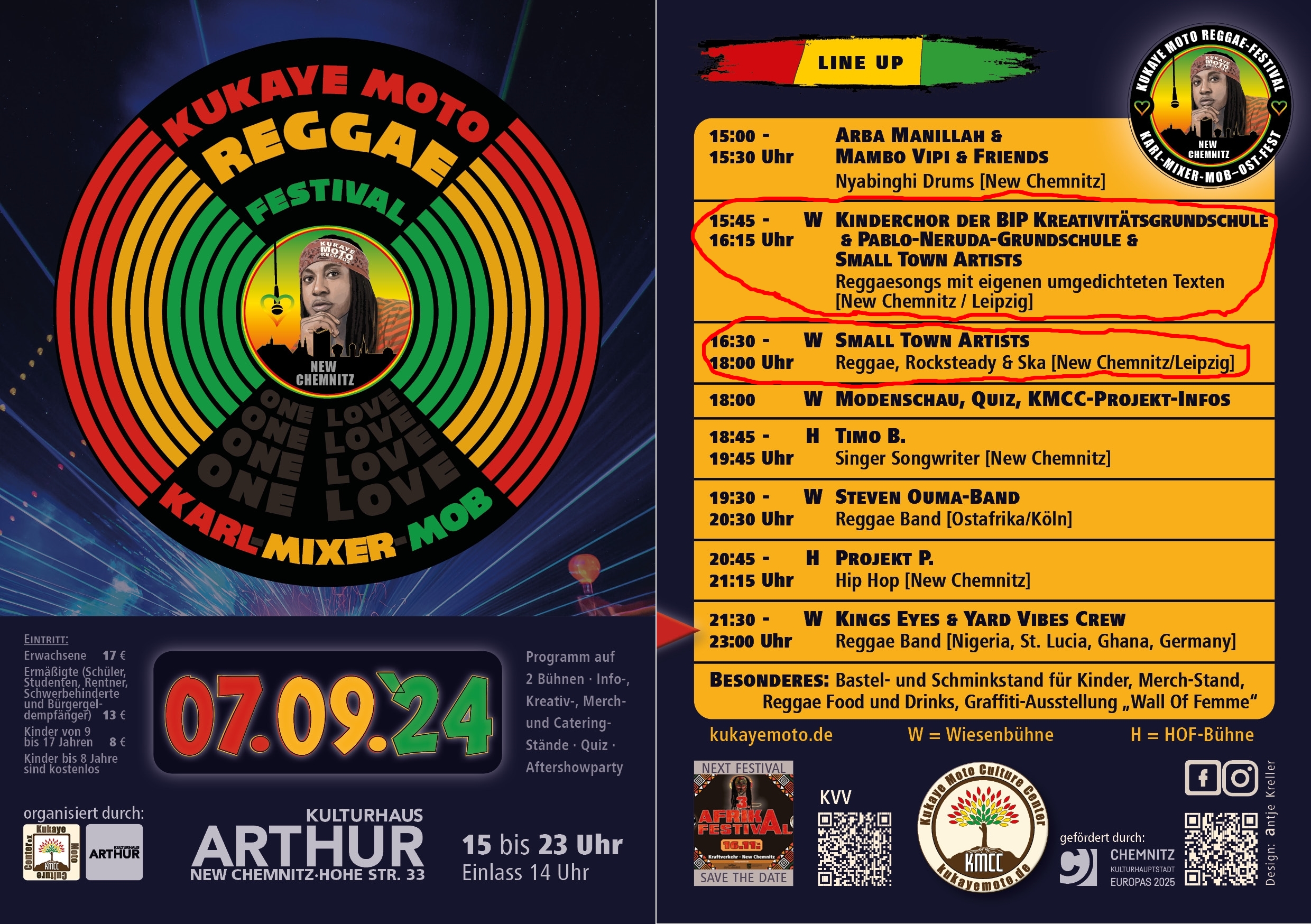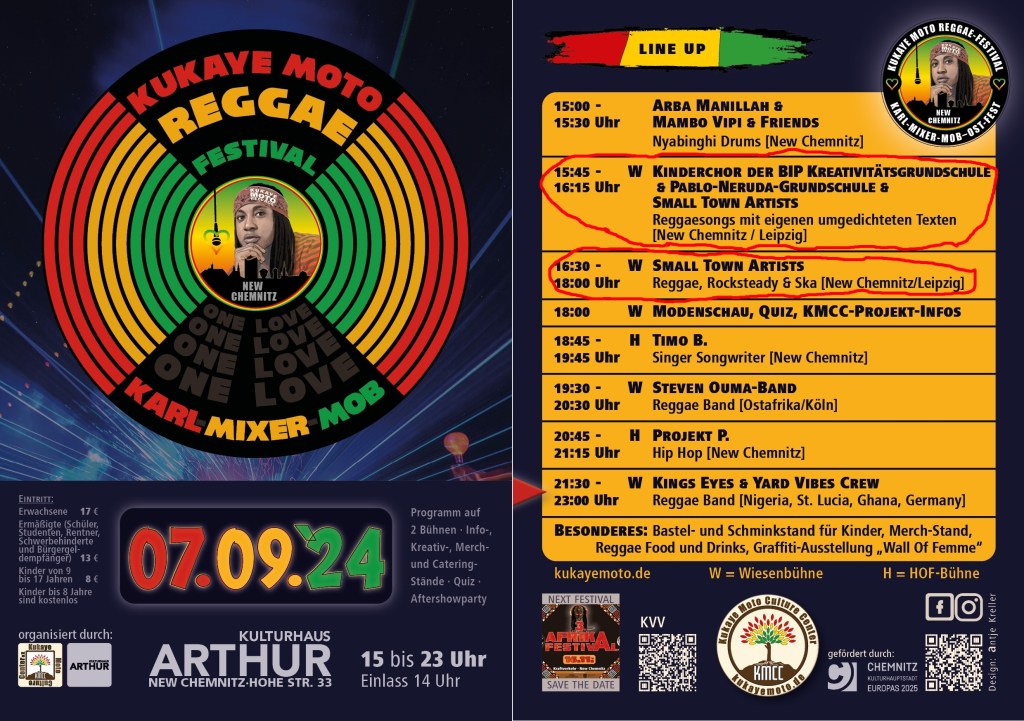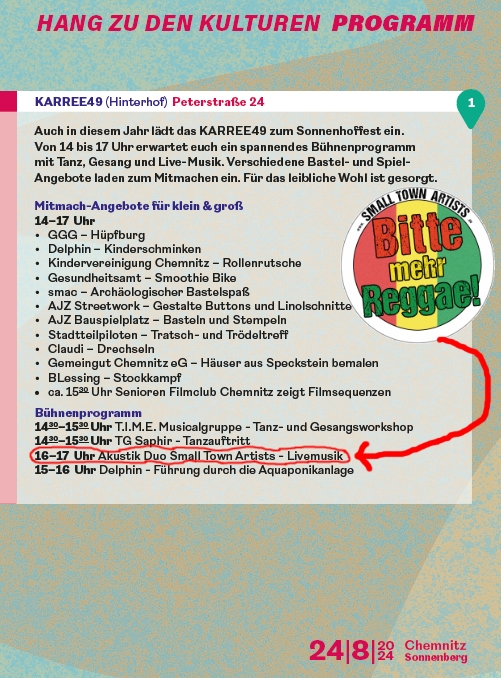 Yeeeees! Es ist wieder soweit, das Karl-Mixer-Mob Reggae-Festival in Chemnitz startet dieses Wochenende! Wir spielen einmal als Band, aaaaber es gibt auch noch ein Special: wir spielen zudem ein kurzes Set mit ca. 40 Chemnitzer Reggae-Kids, die einige unserer Texte umgedichtet haben und diese mit uns singen – Hammer!!!