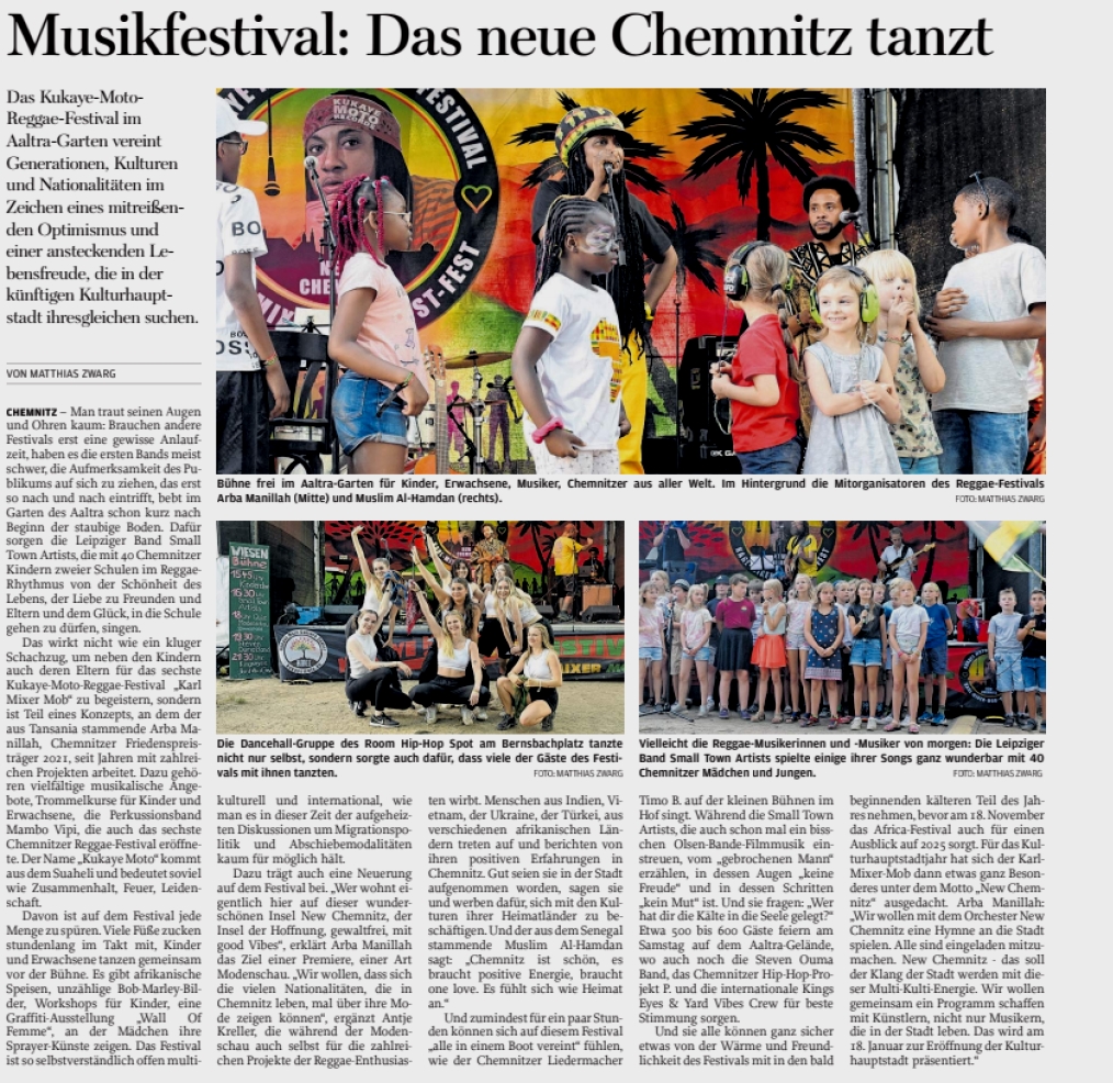Jaja, das Kukaye Moto Reggae-Festival „Karl-Mixer-Mob“… Es war einfach wieder ein unglaublich tolles Festival voller positiver Vibrations und eben all den oben genannten Sachen und noch viiiiiel mehr! Wahnsinn. Ich brauch aber eigentlich gar nicht viel mehr dazu schreiben, denn der folgende Zeitungsartikel gibt einen echt guten Einblick, sogar auch mit Foto von uns zusammen mit dem Kinderchor aus knapp 40 Reggae-Kids 🙂