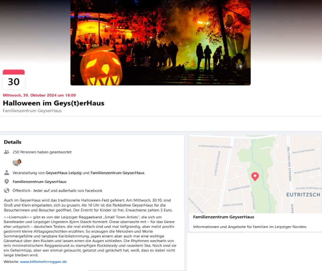 … nee, is nich gruselig! Oder doch? Na lasst euch mal überraschen, vielleicht haben wir ja doch etwas Gruseliges im Songgepäck zum Halloween-Reggae im Geys(t)erhaus. Denn am 30.10. haben wir das Vergnügen auf der herrlichen Parkbühne zu spielen, wenn alle verkleidet und bestimmt viele zudem mit Verbänden durch zu heftige Kürbis-Schnitzereien auf das alljährliche Gruselevent kommen. Das wird schaurig schön!