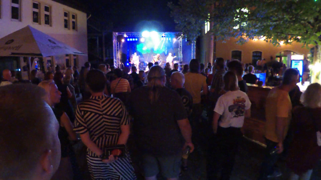 Anfänglich mit etwas schleppender Stimmung, aber als die Dämmerung einsetzte und das ein und das andere Getränk alkoholischer Art vertilgt wurde, wurde es stimmungsmäßig viel lockerer, viele Leute kamen vor die Bühne und dann wurde sogar ordentlich getanzt – auch wenn leider keiner eine Blume im Haar hatte (müsste man eigentlich am Einlass verteilen…!)